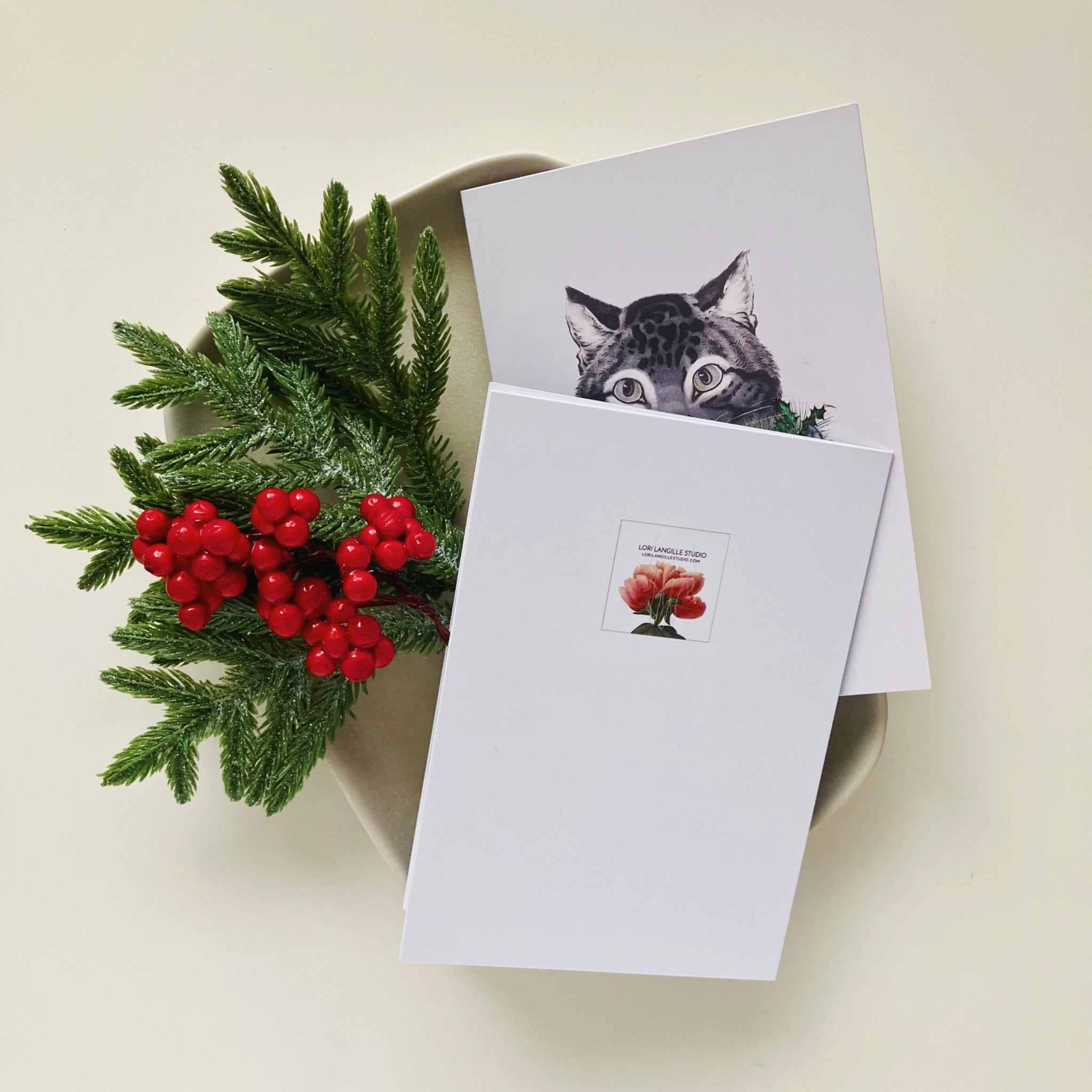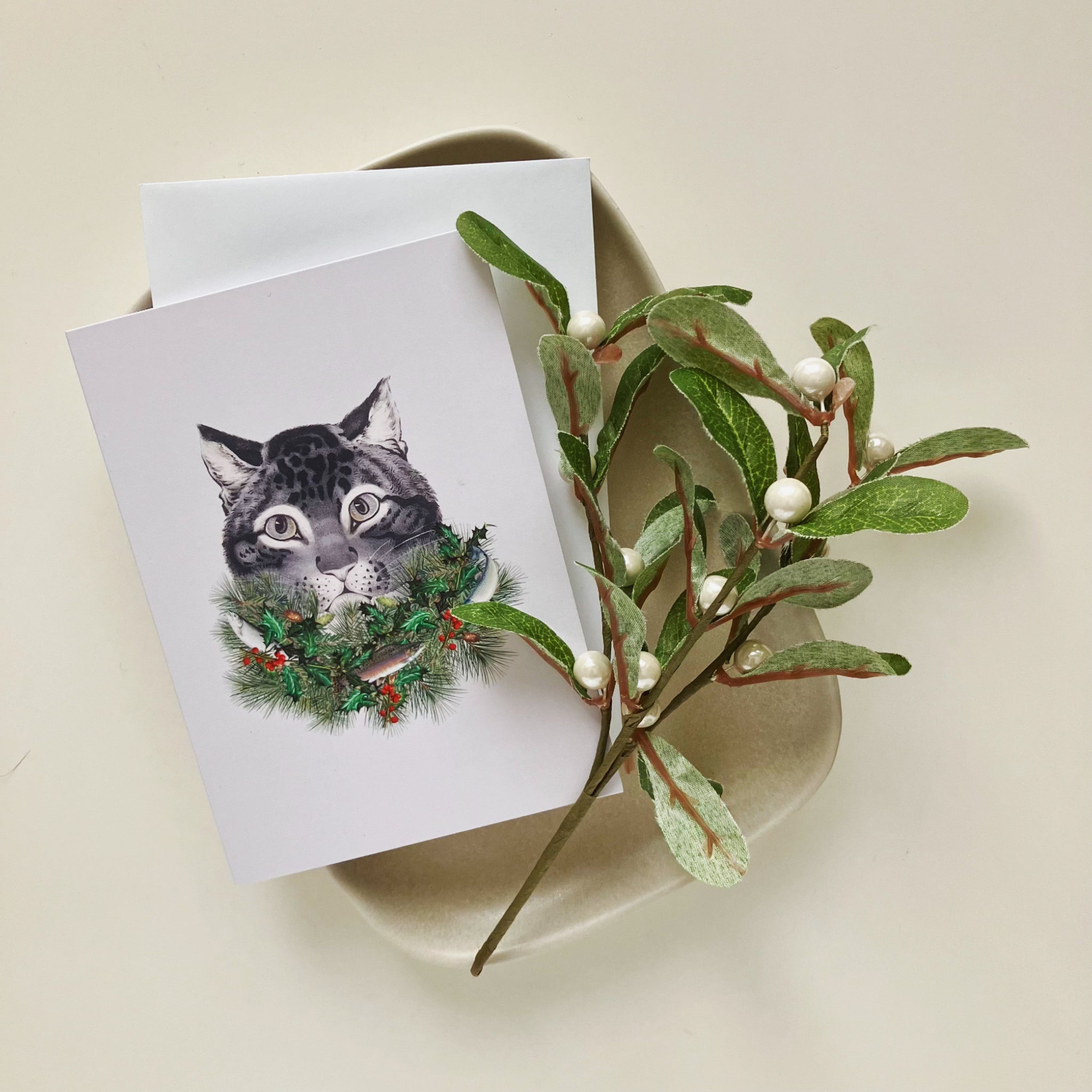 Don't let the innocent look fool you—this little cat has a few fishy snacks tucked into that holiday decoration! The Cat With Wreath card is blank inside for your own greeting. An envelope is included with this card.