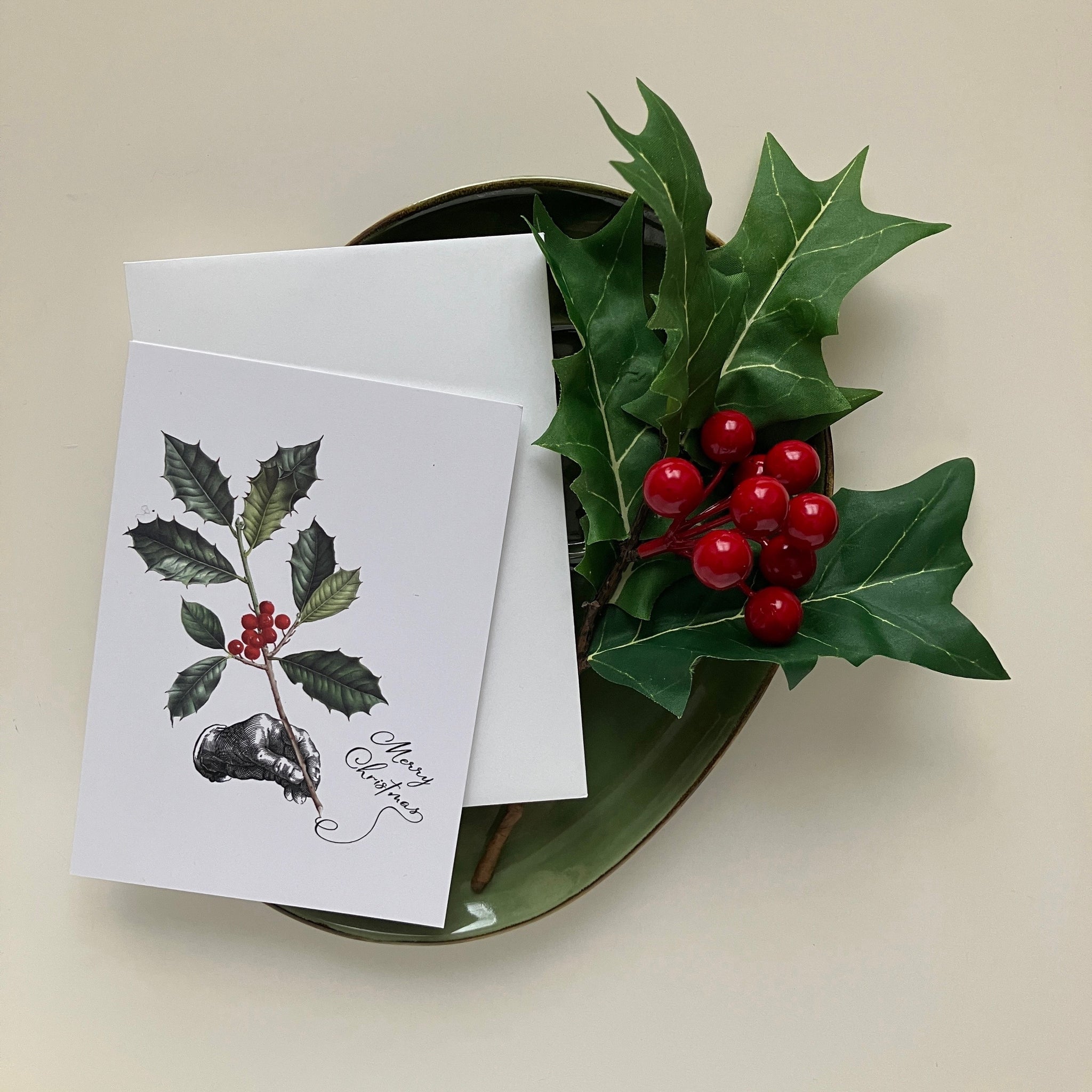 Wish family and friends a happy holiday with the Holly Pen card, featuring a hand with an ink-dipped holly branch adding an elegant flourish to its message of Merry Christmas. Blank inside for your own greeting. An envelope is included with this card.