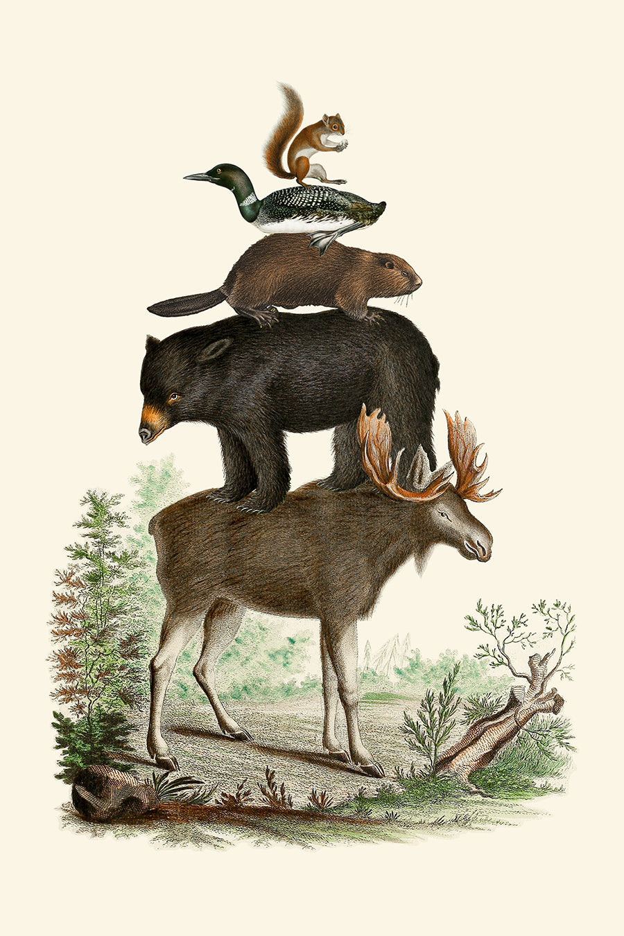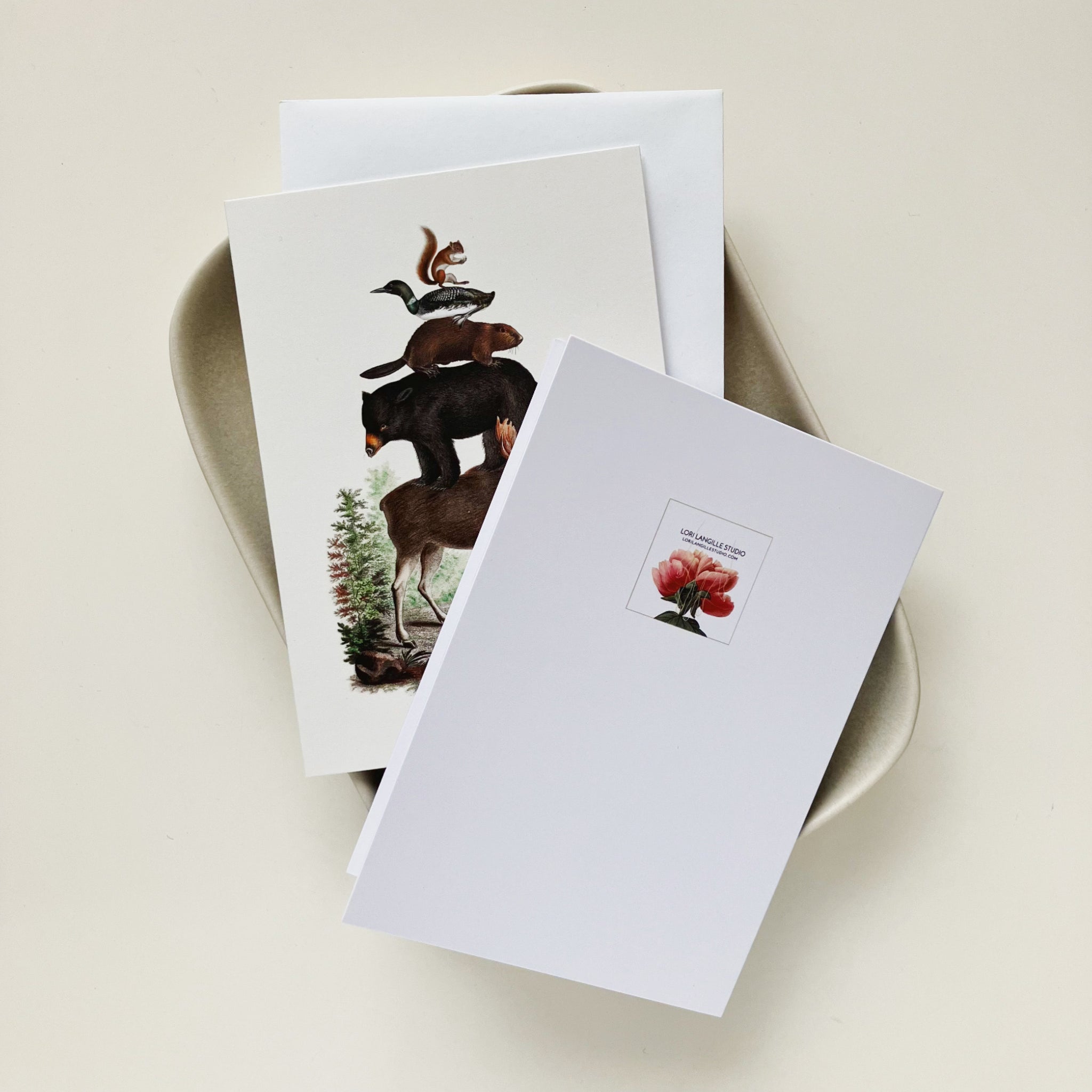 Send a little Canadiana in the mail with the Team Canada postcard, featuring a collage of iconic Canadian creatures—a moose, a bear, a beaver, a loon and a red squirrel—in an acrobatic display. Blank inside for your own personal greeting. This folded note card comes with an envelope.